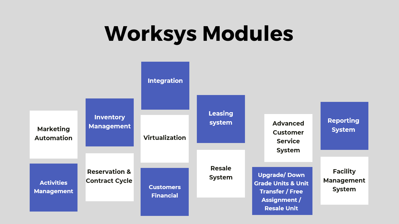 Marketing Automation, Activities Management, Reservation & Contract Cycle, Inventory Management, Integration, Leasing system, Resale System, Customers Financial